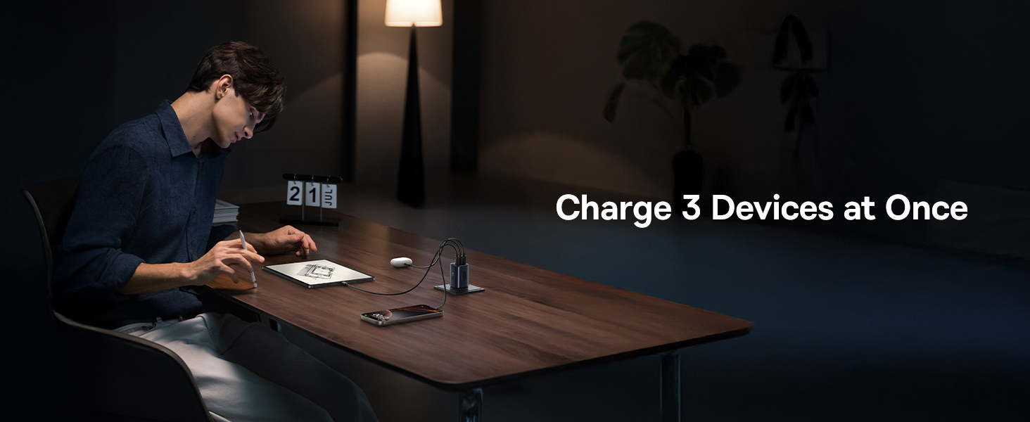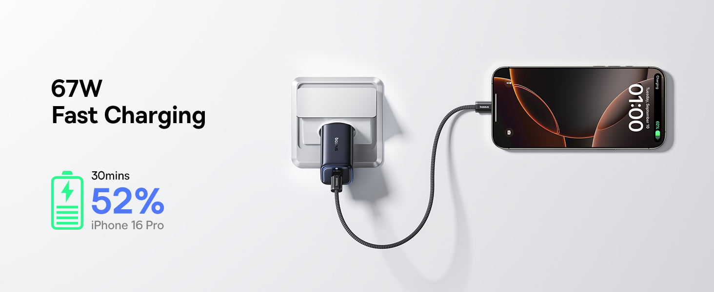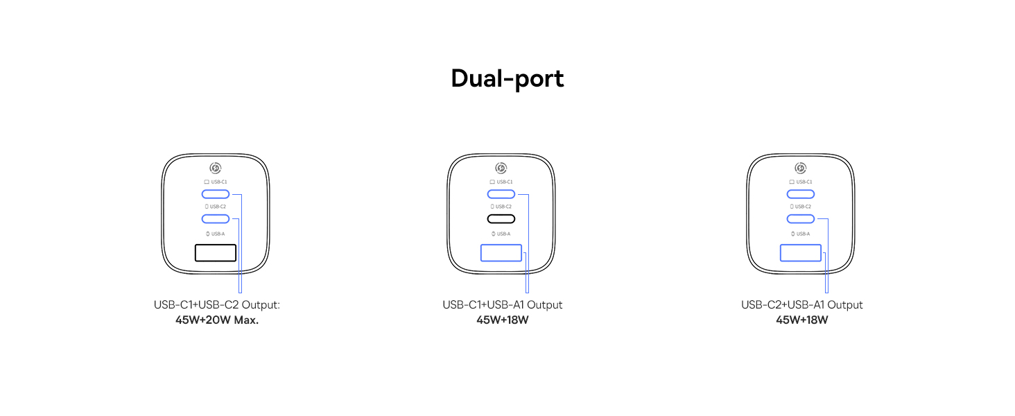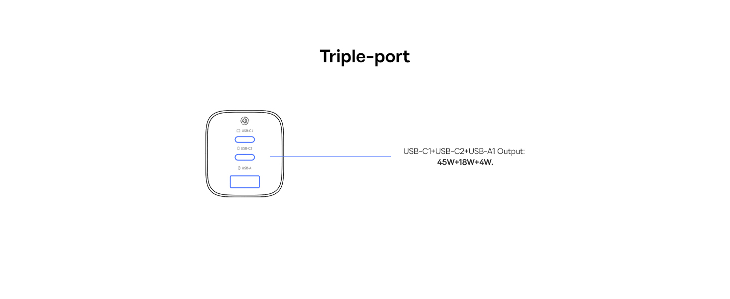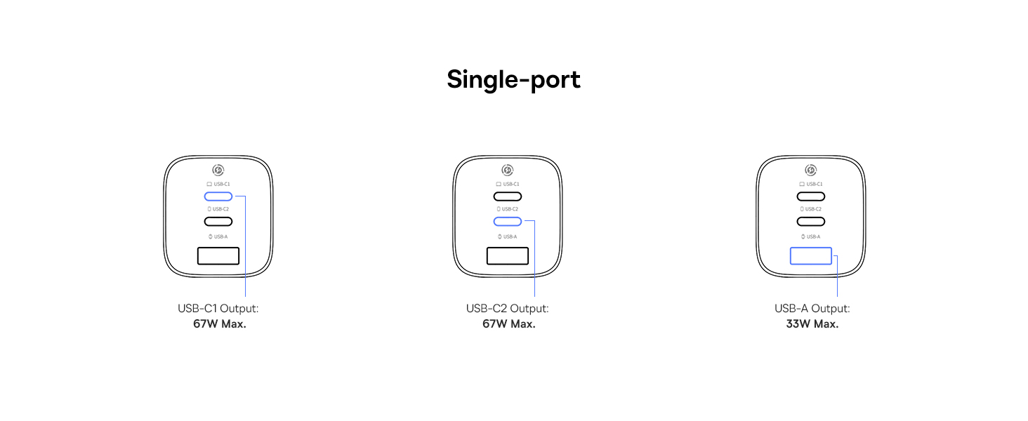 | Выход | Использование только одного порта: USB-C 1/2: 67W Max, 5V/3A, 9V/3A, 12V/3A, 15V/3A, 20V/3.35A USB-A: 5V/3A, 9V/2A, 12V/1.5A Max Одновременное использование двух портов: USB-C1 + USB-C2: 45W + 20W USB-C 1/2 + USB-A: 45W + 18W Одновременное использование трёх портов: USB-C1 + USB-C2 + USB-A: 67W |